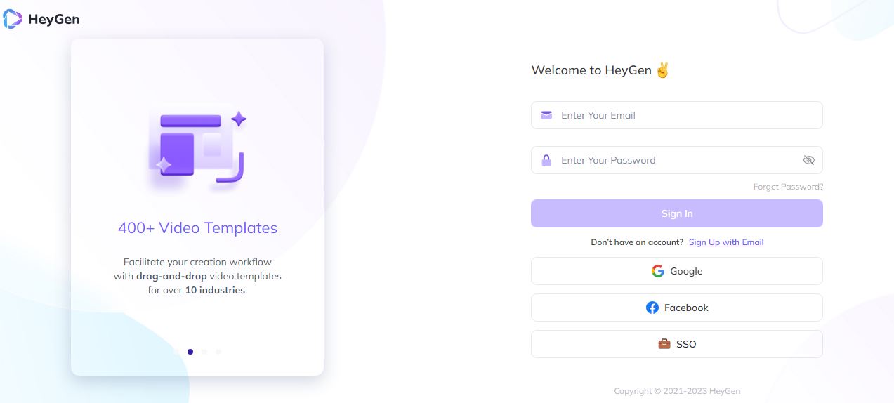 1. Kunjungi website HeyGen terlebih dahulu. Di sini penulis memilih untuk menggunakan HeyGen dengan akses terbatas. Tentunya kamu bisa memilih untuk upgrade akses yang ada di website ini dengan membayar sejumlah uang tertentu. Login ke dalam website HeyGen, di sini penulis memilih login dengan akun Google.