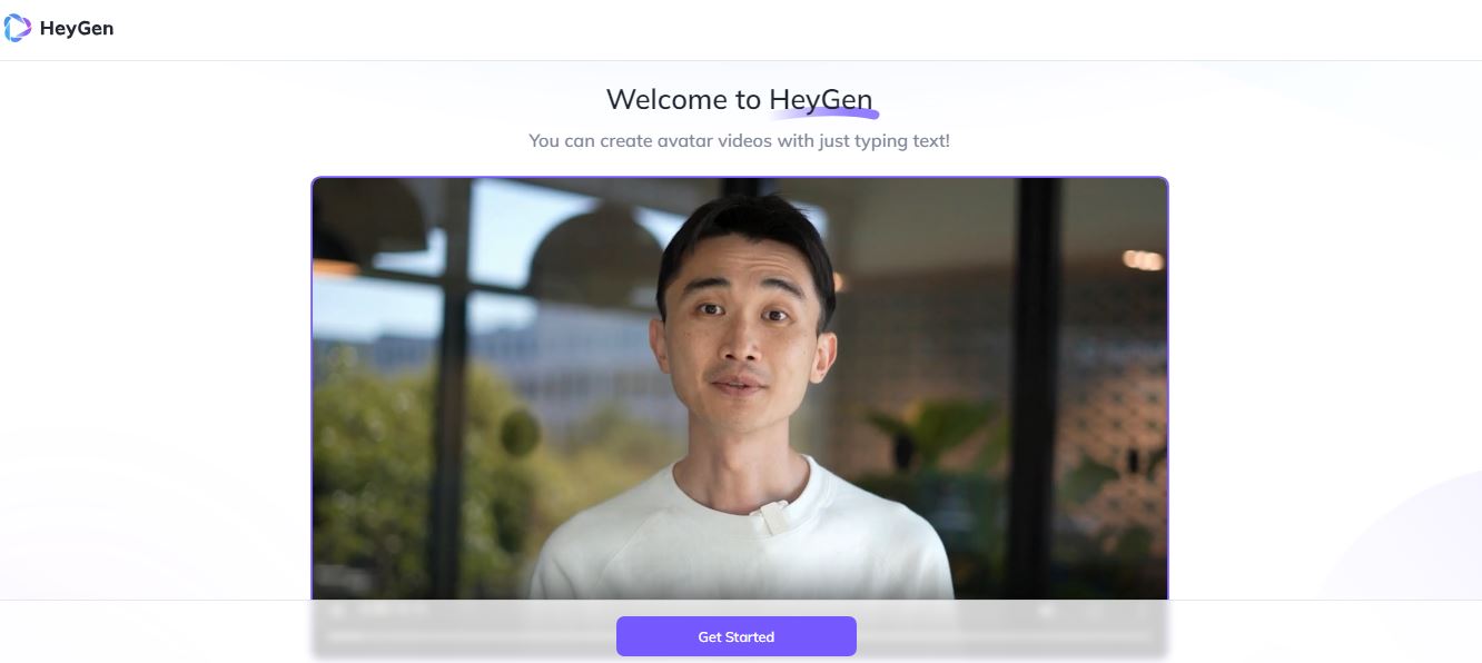 2. Setelah itu kamu akan disambut laman website perkenalan singkat dengan HeyGen. Kamu bisa menyimak video yang ada dengan seksama. Apabila telah selesai, tekan tombol Get Started.