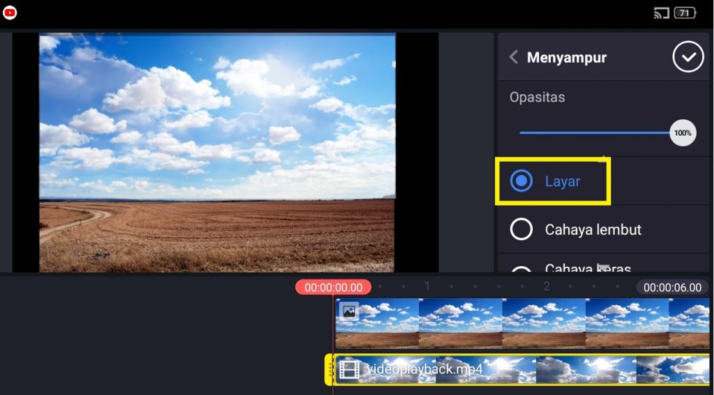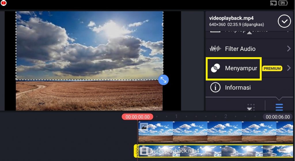 10. Bila sudah klik video awan bergerak dan pilih ‘Menyampur’ untuk menggabungkan antara foto dan video.