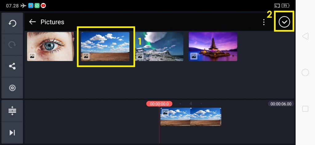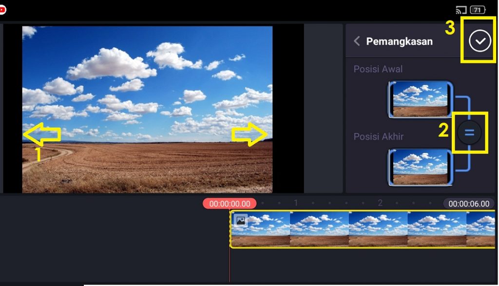 Untuk melakukannya gunakan dua jari yang digeser ke luar atau ke dalam sesuai kebutuhan kamu. Agar awalan foto dan akhiran foto memiliki posisi yang sama klik tanda ‘=’. Klik centang bila kamu sudah selesai.