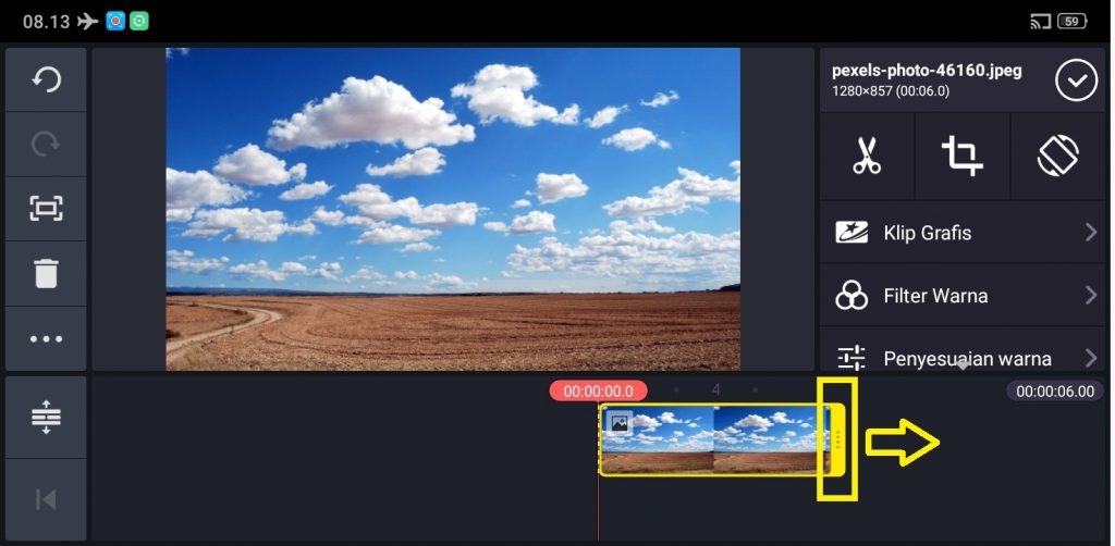 6. Panjangkan durasi, dengan klik titik tiga di belakang foto, dan tarik ke belakang.