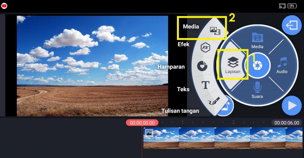 8. Sekarang kita akan memasukkan video awan bergeraknya. Pilih ‘Lapisan’ – ‘Media‘ – cari video awan bergerak – klik centang.