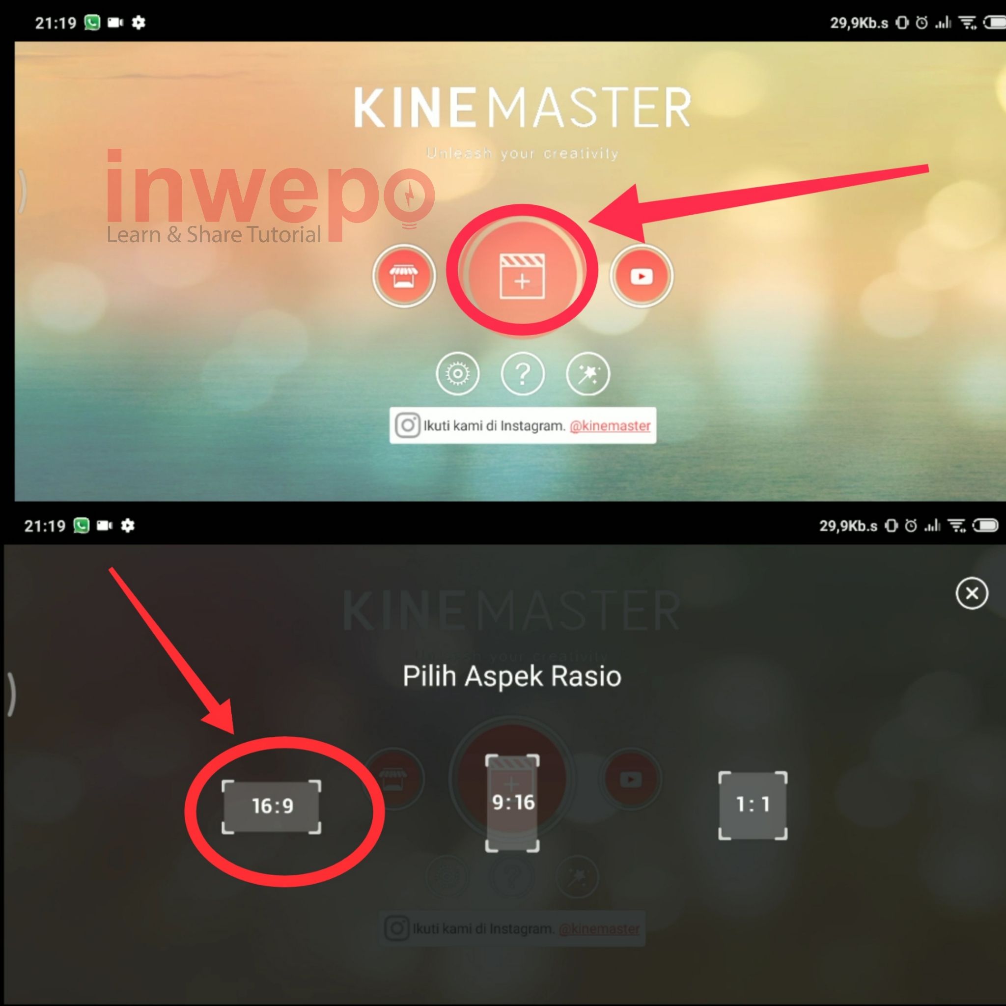 2. Langkah kedua, buka aplikasi Kinemaster kemudian tap icon plus yang berada di tengah dan pilih rasio 16 : 9.