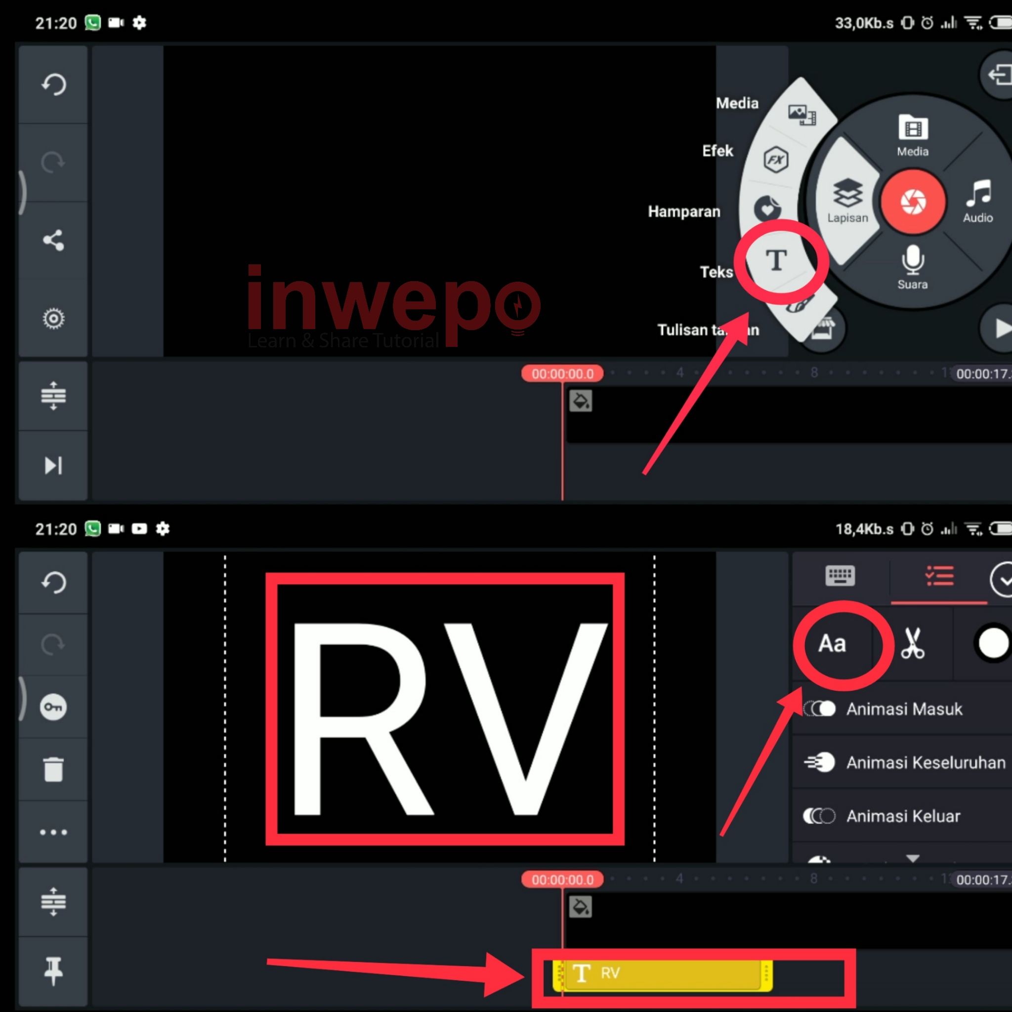 4. Langkah keempat, tap menu Lapisan lalu pilih menu Text untuk menambahkan tulisan. Perbesar ukuran text sesuai dengan layar dan gunakan icon Aa untuk mengubah style fontnya. Pastikan untuk durasi text sama dengan latar.