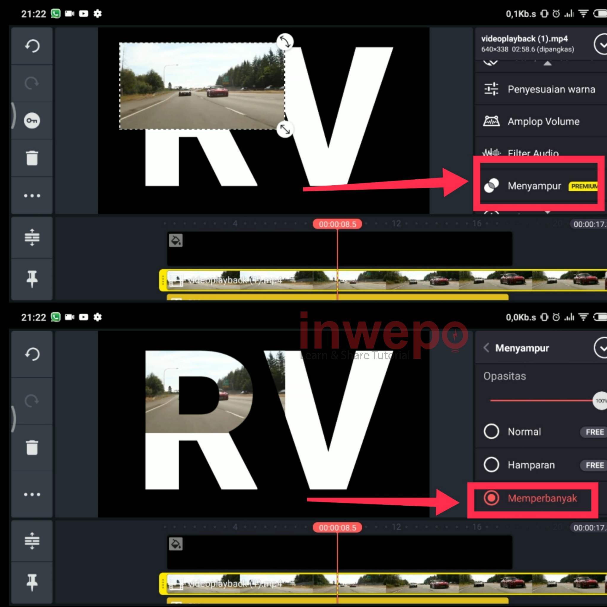 5. Langkah kelima, pilih menu lapisan lagi dan pilih media untuk menambahkan video jika sudah cari menu menyampur kemudian pilih efek memperbanyak.