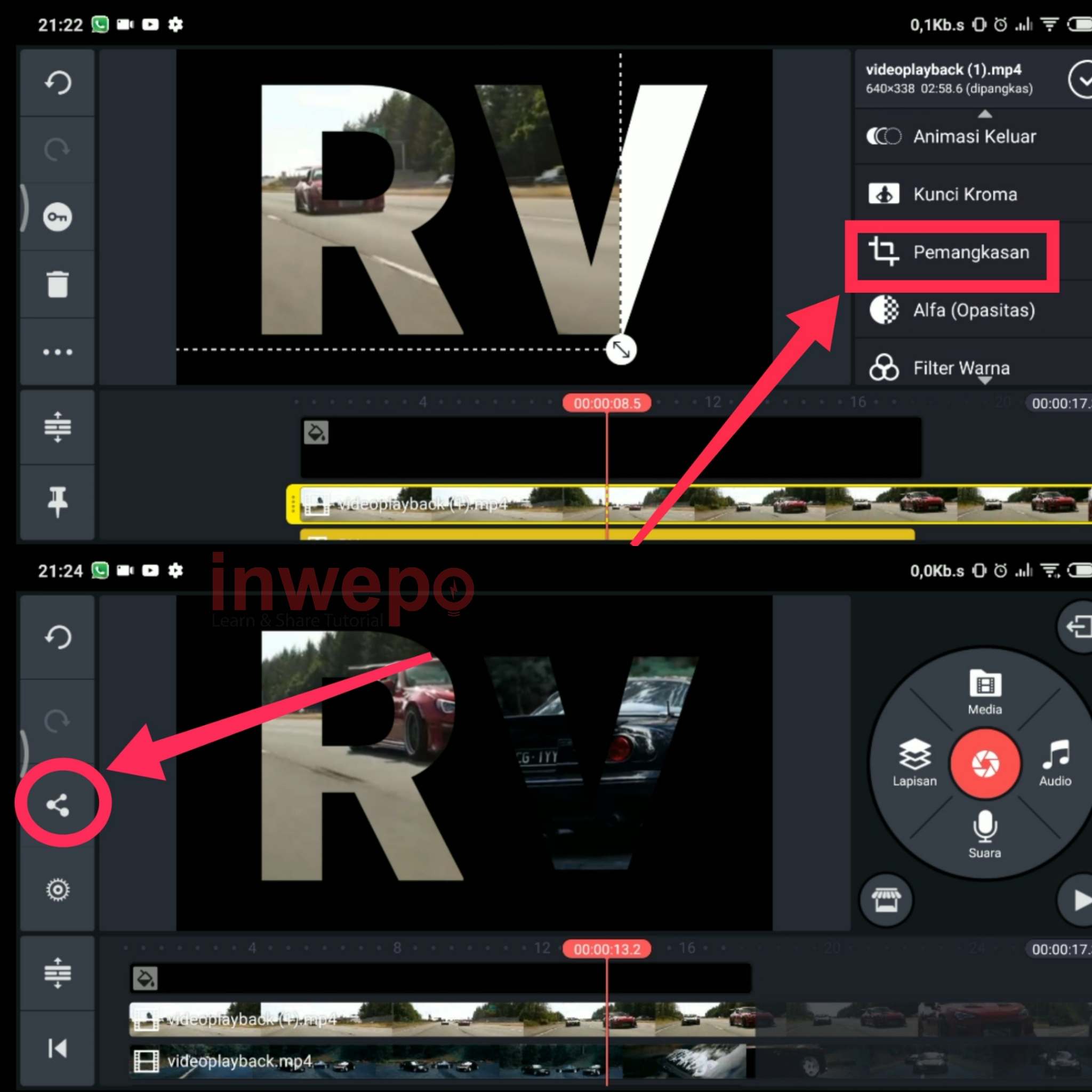 6. Langkah keenam, gunakan menu crop atau pemangkasan untuk menyesuaikan video dengan text. Jika kamu punya lebih dari satu video kamu bisa menambahkan lagi untuk huruf atau text selanjutnya. Jika dirasa sudah semuanya tap icon berbagi untuk mulai menyimpannya.