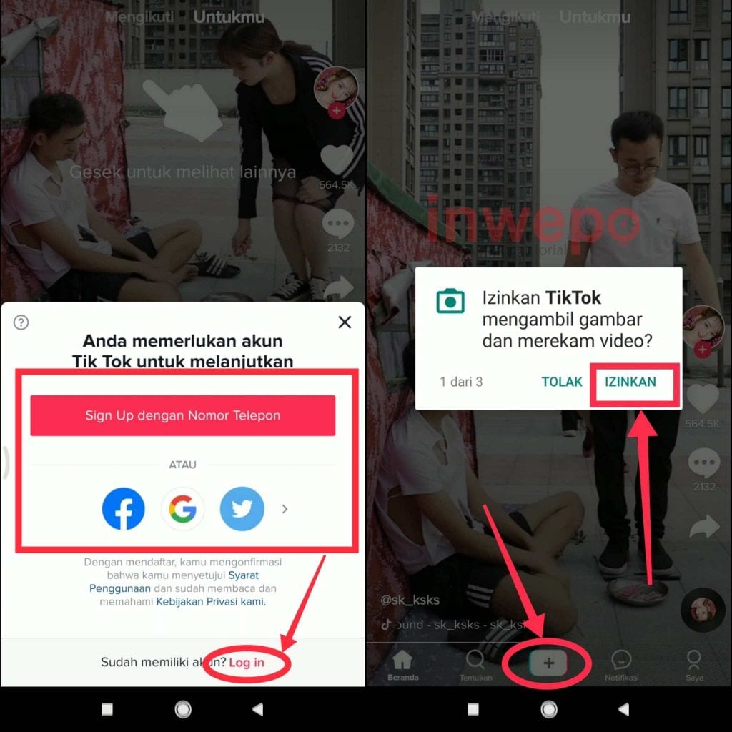2. Buka aplikasi Tik Tok dan daftar dahulu menggunakan nomor telepon seluler atau akun media sosial. Berikutnya tapicon plus dan beri izin akses pada aplikasi.