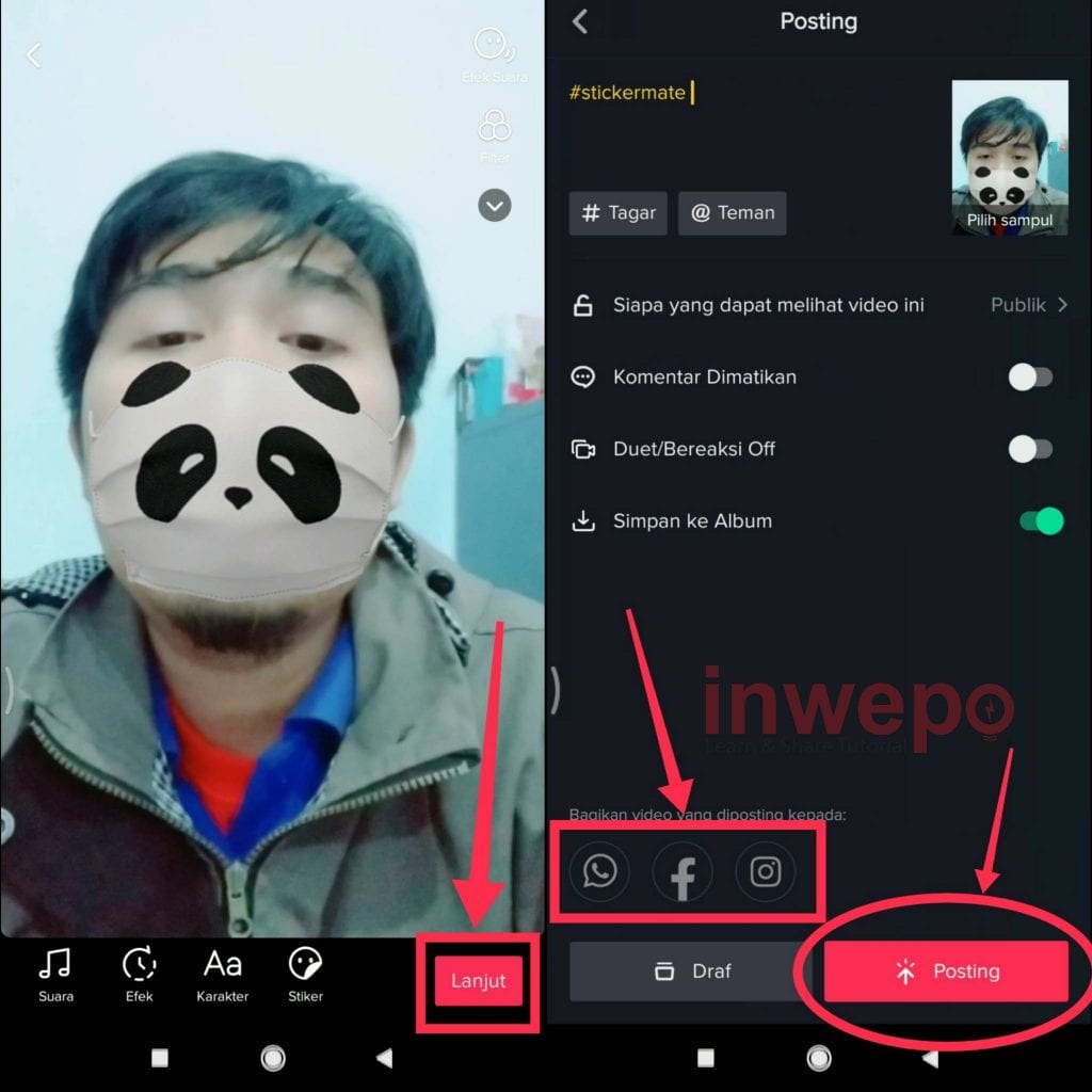 5. Langsung saja tap lanjut, kemudian kamu bisa langsung memposting hasil video kamu tadi ke aplikasi Tik Tok atau ke jejaring media sosial yang lain.