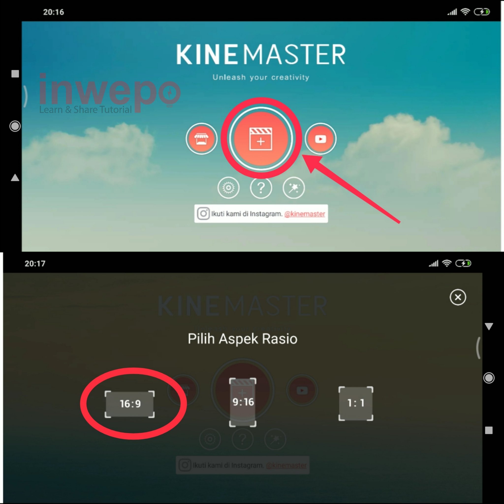 2. buka aplikasi kinemaster pro lalu tap icon plus yang berada di bagian tengah selanjutnya pilih rasio di 16 : 9.