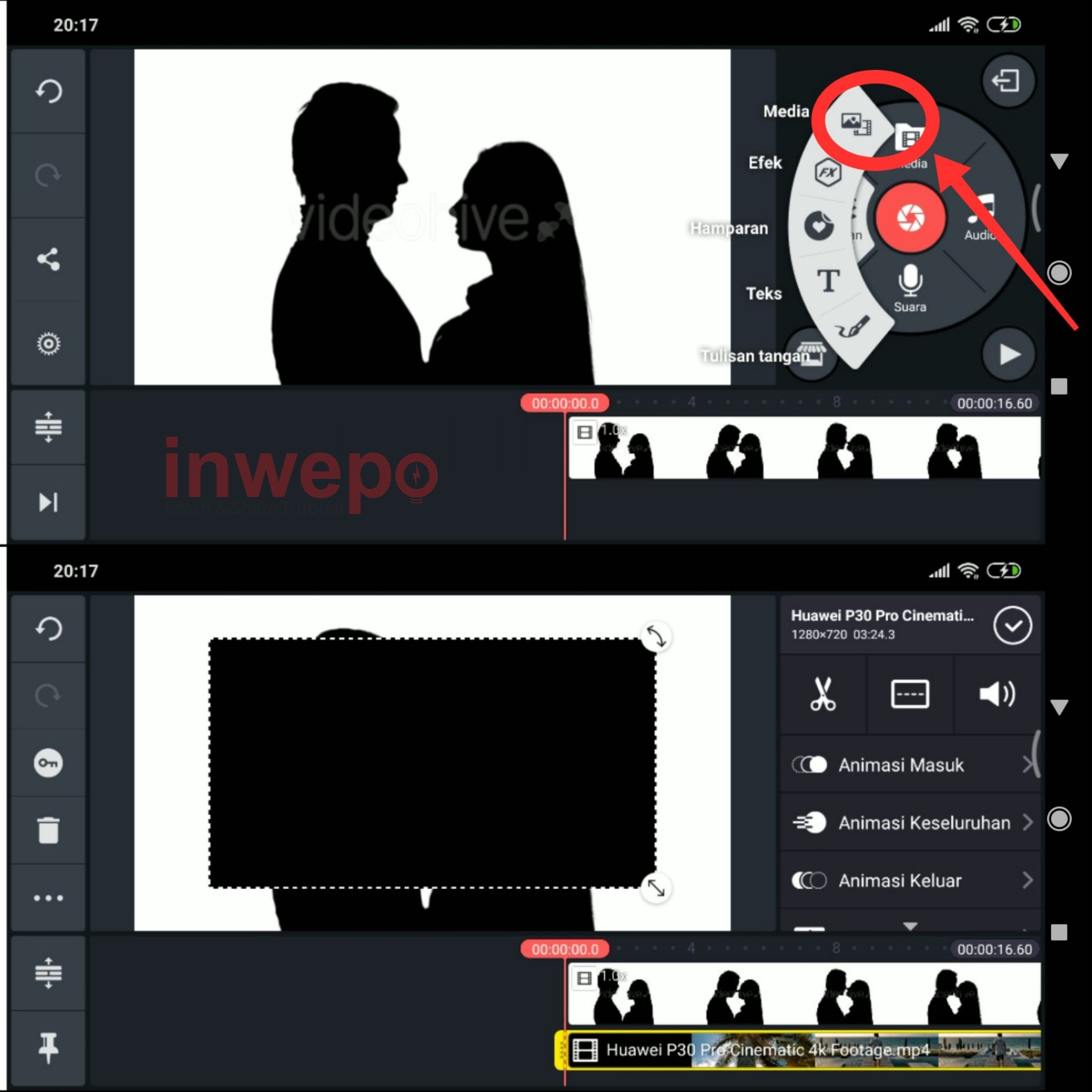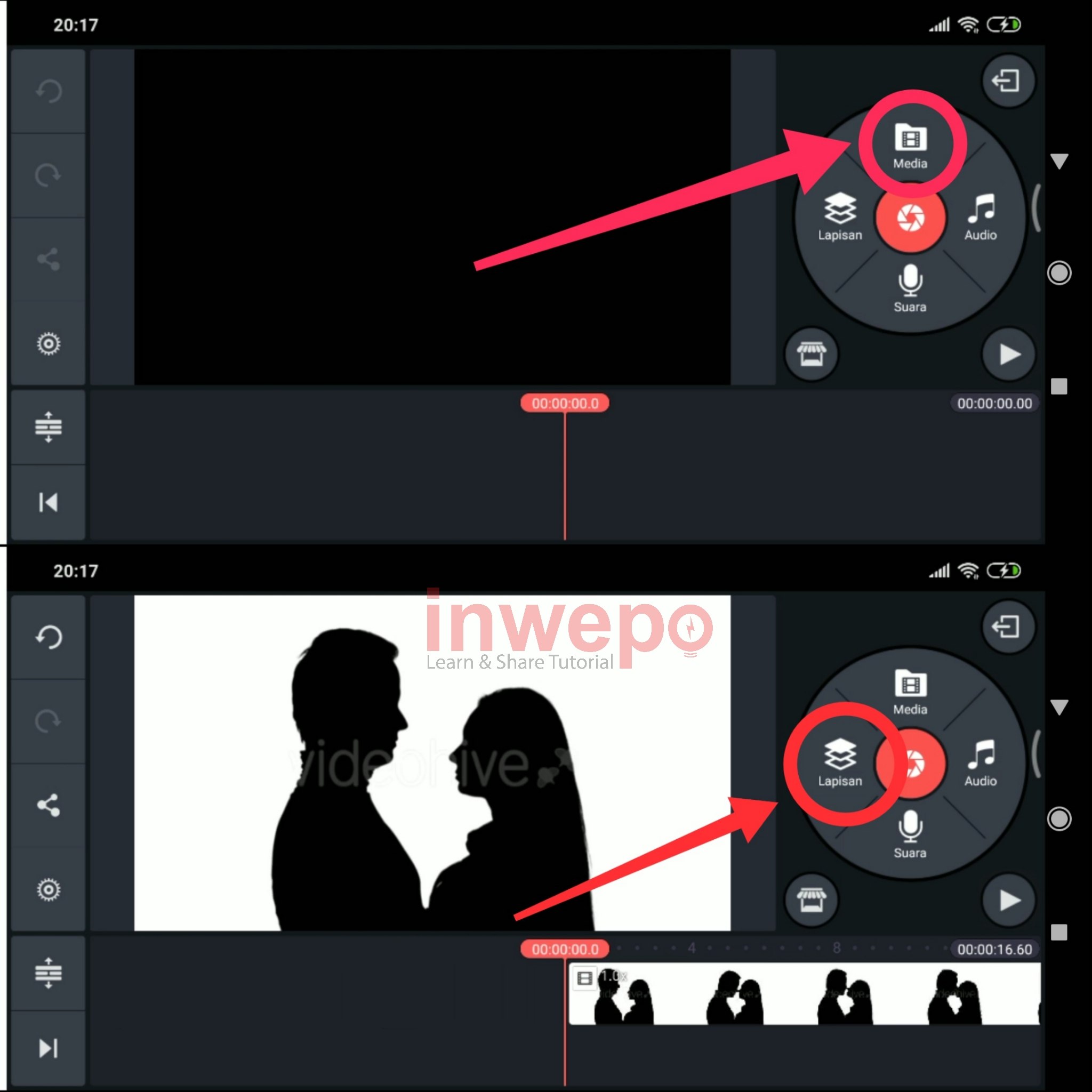 3. tap menu Media untuk memasukkan video pertama atau siluet. Kemudian tap menu lapisan.