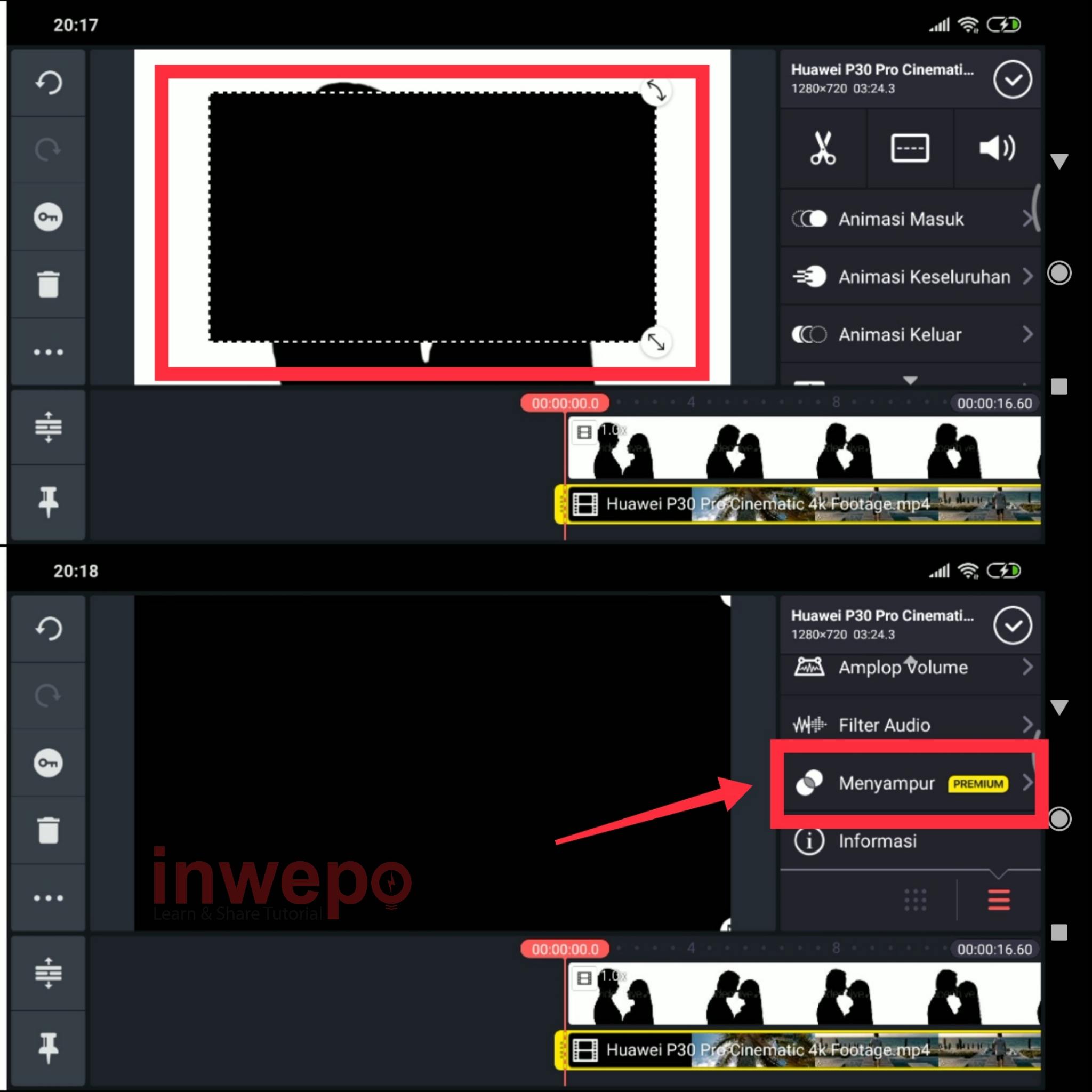5. sesuaikan video kedua agar memenuhi layar. Berikutnya scroll kebawah di bagian menu dan pilih menu Menyampur.