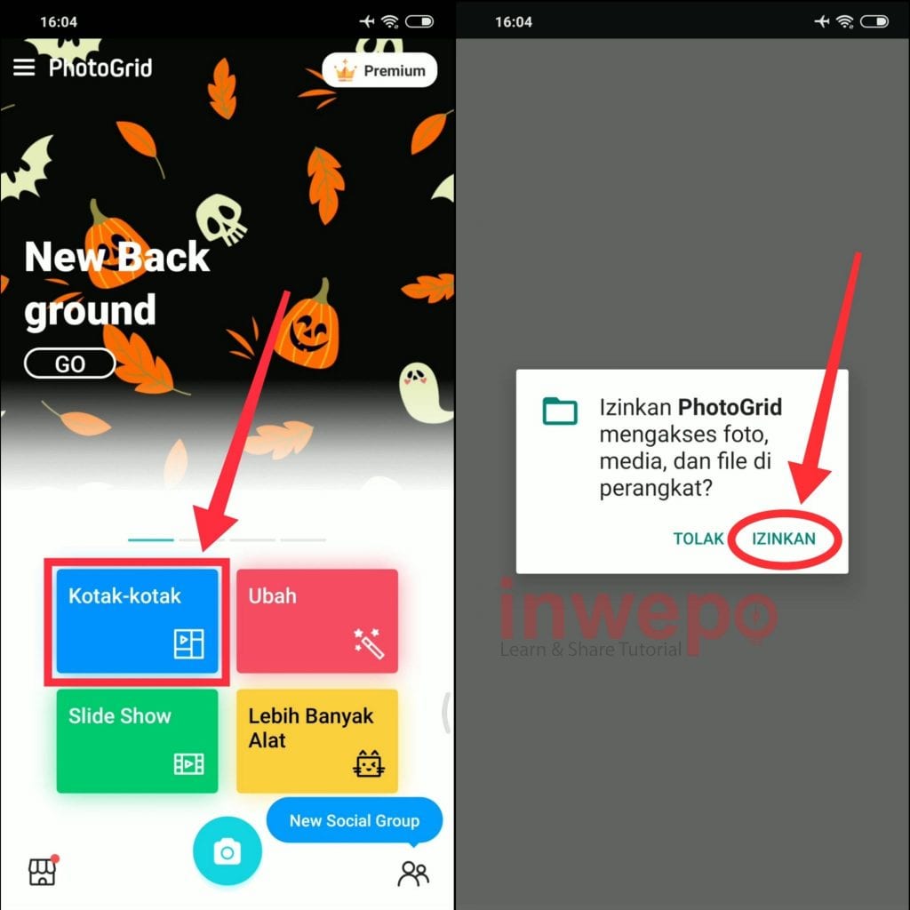2. Buka aplikasi PhotoGrid kemudian pilih menu Kotak-kotak selanjutnya beri izin akses pada aplikasi.
