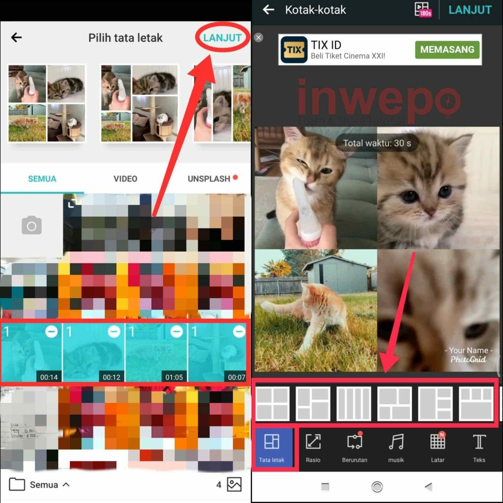 3. Pilih beberapa video yang akan dijadikan kolase lalu tap menu Tata letak kemudian pilih template kolase yang muncul di bagian atasnya.