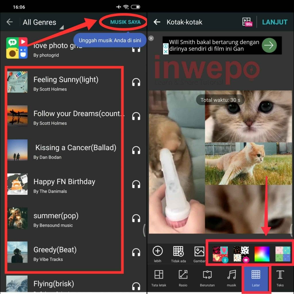 5. Kamu bisa menambahkan musik langsung dengan yang ada di aplikasi atau menambahkan musik kamu sendiri dengan tap Musik Saya. Tambahkan background pada video dengan memilih menu Latar Belakang.