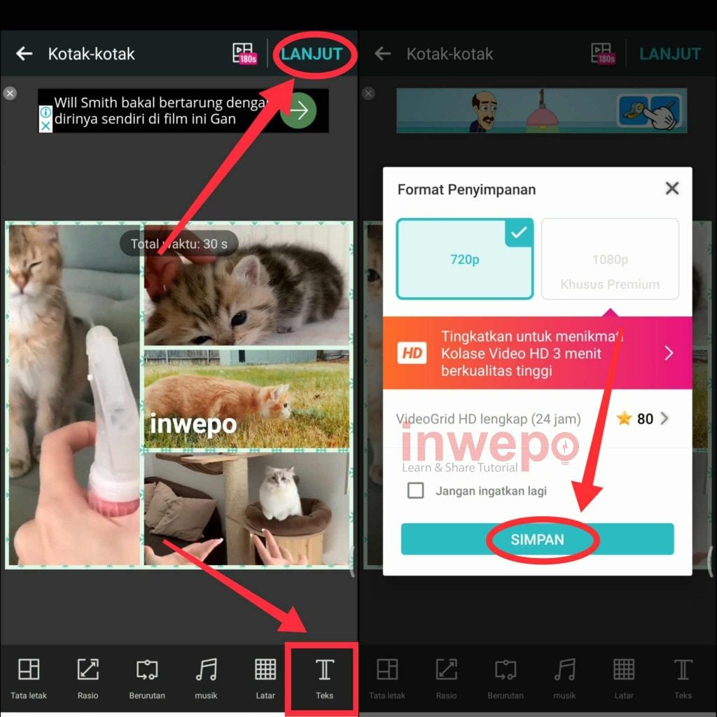 6. Tap menu Text untuk menambahkan tulisan. Jika dirasa sudah semuanya tap menu LANJUT. Terakhir tap menu Simpan untuk menyimpan video ke galeri smartphone kamu.