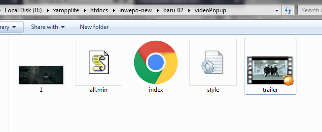 Simpan kode HTLM5 di atas di folder xampplite – htdocs – buat folder baru dengan nama VideoPopup – simpan kode di atas dengan nama index.html.