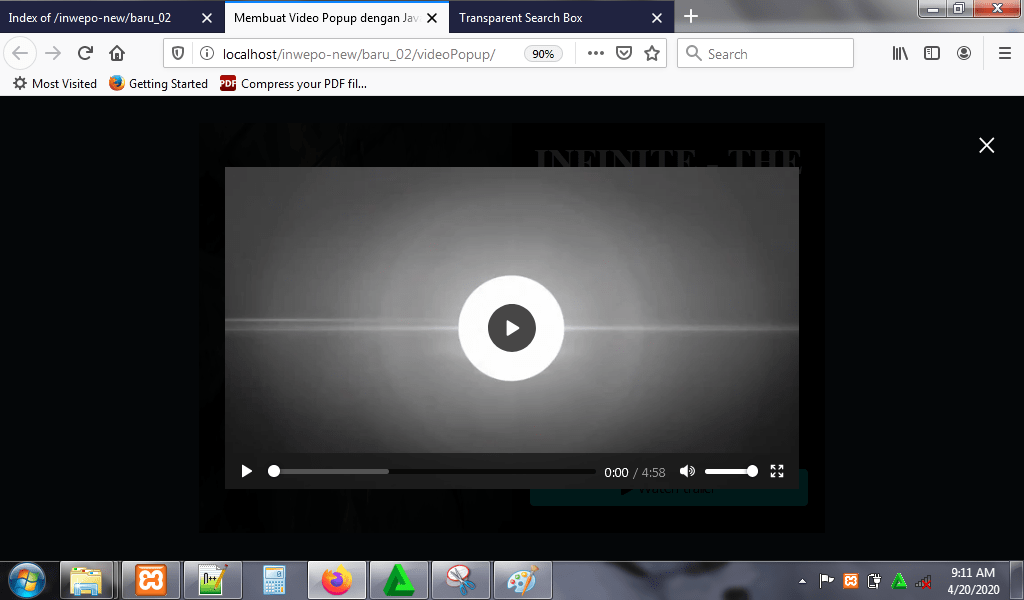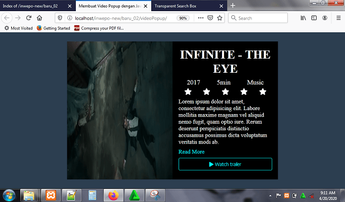4. Untuk melihat hasil script code di atas, kamu bisa buka browser kamu ketiklah http://localhost/VideoPopup.