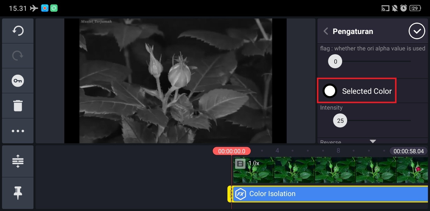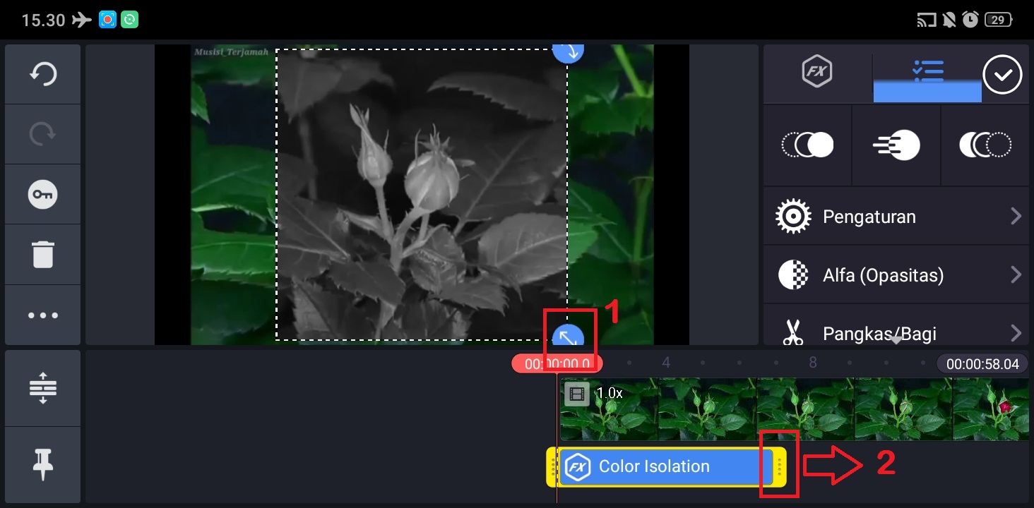 9. Perbesar ukuran efek sesuai kebutuhan, dan perpanjang durasi efek color isolation.