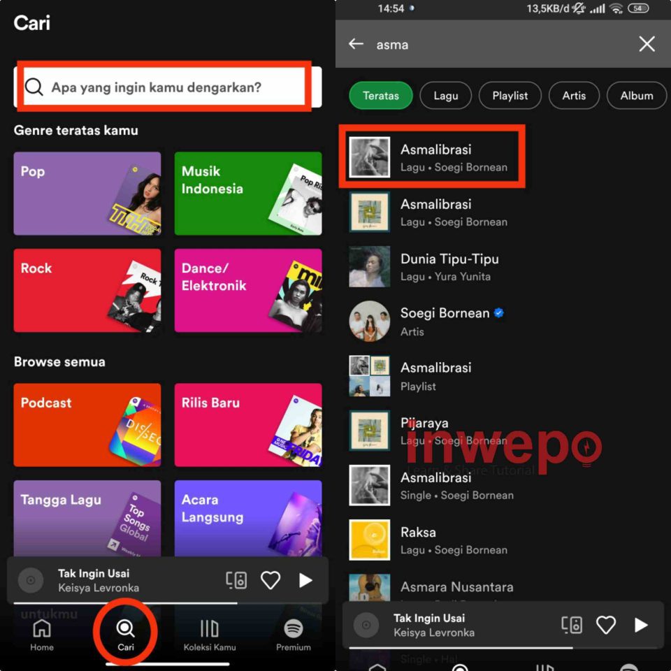 1. Buka aplikasi Spotify di Smartphone kalian masing-masing, lalu tap tombol pencarian lalu cari lagu yang akan kalian putar atau mainkan.