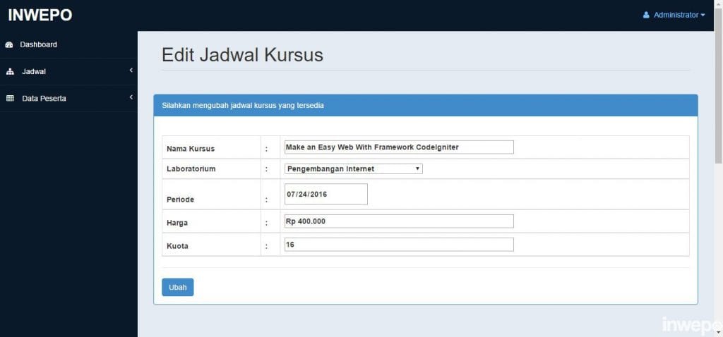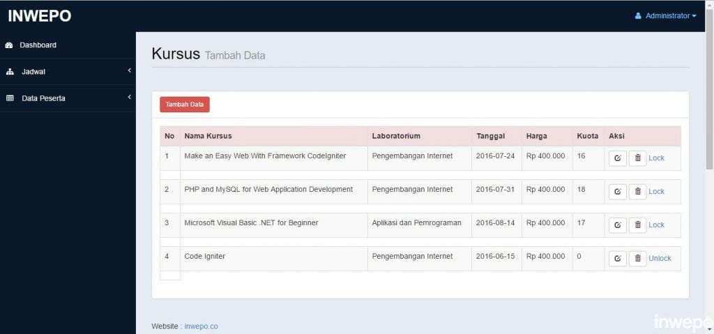 Tugas seorang administrasi dari website pendaftaran kursus adalah mengatur jadwal yang tersedia, megecek data peserta yang masuk. Nah, penulis akan bahas satu per satu dulu untuk kinerja admin dari website ini.