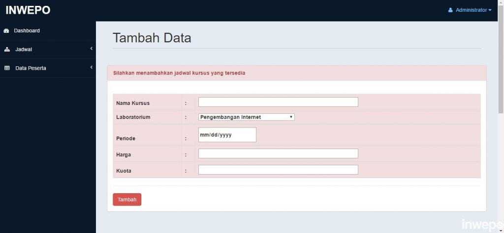 4. Membuat tampilan untuk menambah jadwal kursus dengan nama file form_tambah di dalam folder C:\xampp\htdocs\inwepo\application\views\admin.