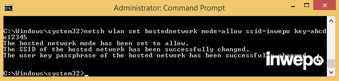 netsh wlan set hostednetwork mode=allow ssid=inwepo key=abcde12345