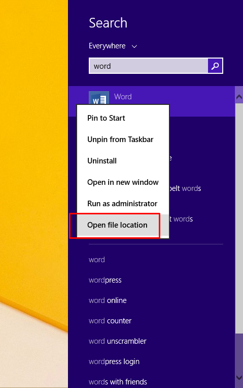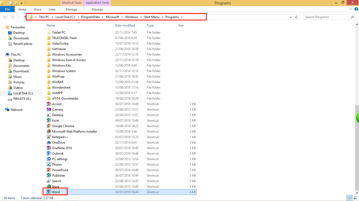 1. Cari Letak Direktori Microsoft Word Disimpan. Tekan Tombol Windows + S, kemudian ketik Word.
