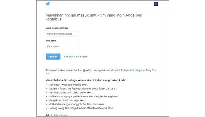5. Setelah itu, silakan masukkan username dan password akun Twitter lain yang ingin dibuka.
