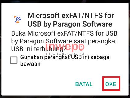 3. Jika kedua aplikasi sudah terunduh dan terpasang, kamu hubungkan kabel OTG ke Hard Disk dan Android kamu, maka akan muncul notifikasi seperti di bawah dan kamu tap OKE (jika tidak muncul, silahkan baca penjelasan di akhir artikel).