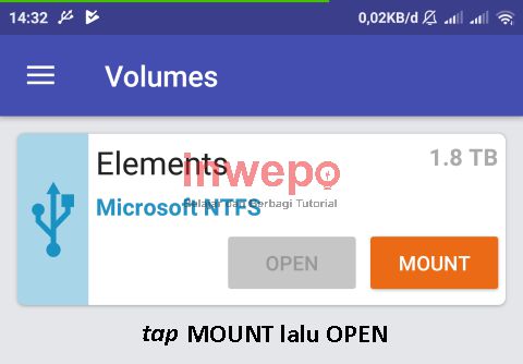 4. Lalu kamu tap pada tombol MOUNT dan klik OPEN untuk membuka berkas-berkas di Hard Disk kamu (jika tampilan di bawah tidak muncul, kamu buka secara manual aplikasi Microsoft exFAT/NTFS yang telah kamu unduh sebelumnya).
