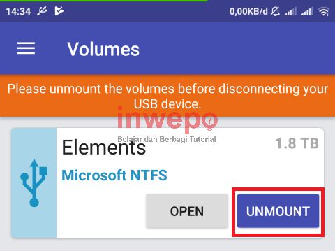 1. Kamu buka aplikasi Microsoft exFAT/NTFS for USB by Paragon Sofware dan kamu tap pada tombol UNMOUNT.