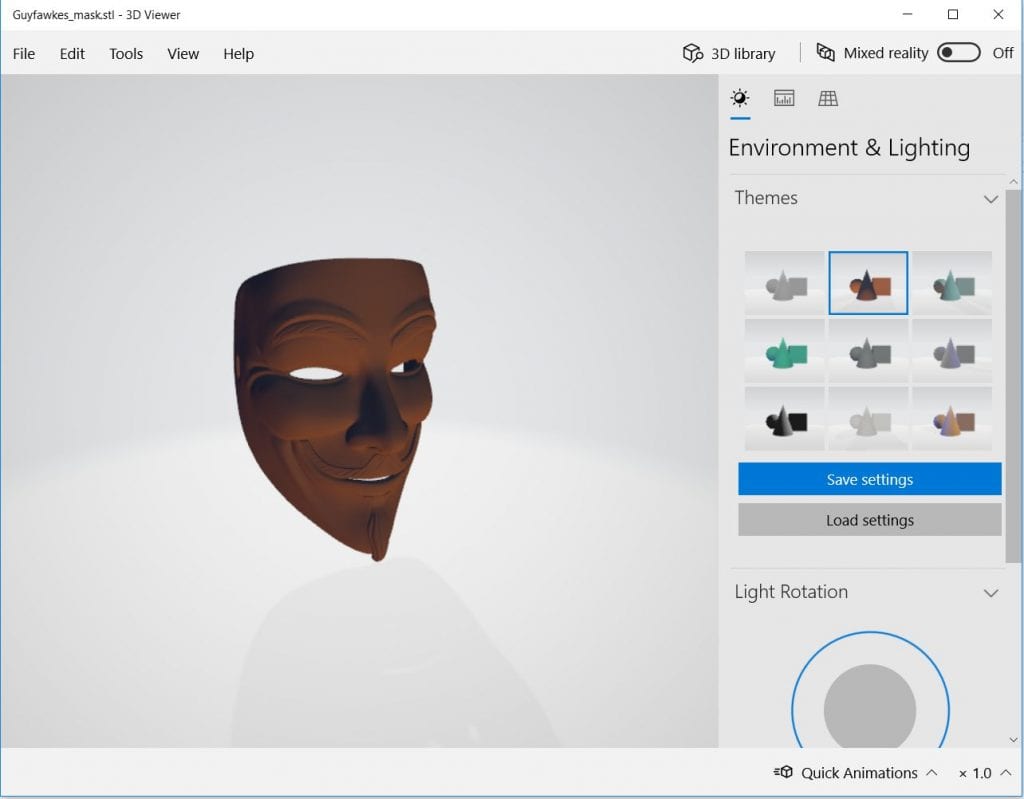 5. Kamu akan mendapatkan tampilan obyek dari berkas 3D yang kamu miliki, beberapa ekstensi berkas 3D ada yang sudah terpasang warna ada juga yang masih polos, untuk kasus penulis, penulis mendapatkan obyek yang belum memiliki warna, kamu bisa memberikan warna pada bagian Themes.