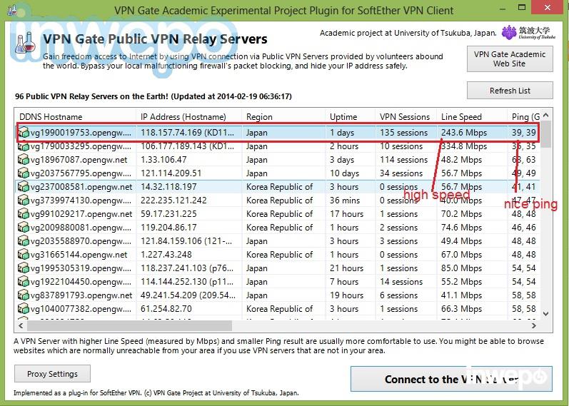3. Pilih server yang line speed-nya besar dan ping-nya kecil agar dapat koneksi cepat. Kemudian pilih Connect to the VPN Server.