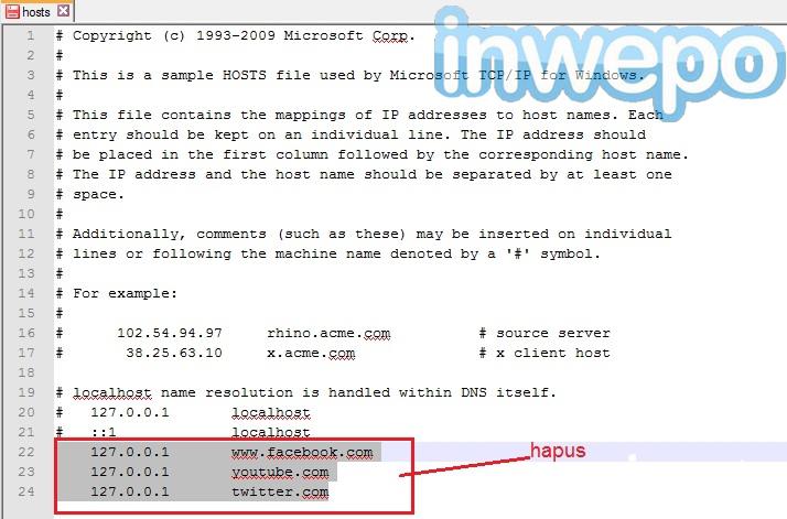Beberapa hari yang lalu saudara meminta bantuan karena komputer kantor yang di pakai terhubung internet tetapi tidak bisa membuka situs seperti facebook, twitter, youtube dan sebagainnya. Akhirnya penulis mencoba membantunya dengan mengecek komputernya melalui remote dari rumah. Setelah di cek ternyata ada pada file host.. hehe. Langsung saja penulis hapus nama-nama situs yang di blokir tersebut dan akhirnya berhasil 🙂