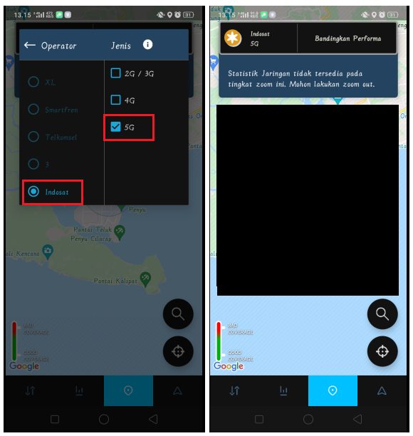 3. Untuk hanya bisa menampilkan jaringan 5G saja, tekan menu Semua 2G/ 3G/ 4G/ 5G. Kemudian, akan muncul dua buah kolom yaitu kolom Operator dan kolom Jenis. Di kolom operator, pilih operator kartu SIM yang kamu gunakan saat ini. Di kolom Jenis, hanya beri checklist pada jaringan 5G Kemudian, aplikasi akan menampilkan informasi ketersediaan jaringan 5G di lokasi kamu saat ini. Selesai.