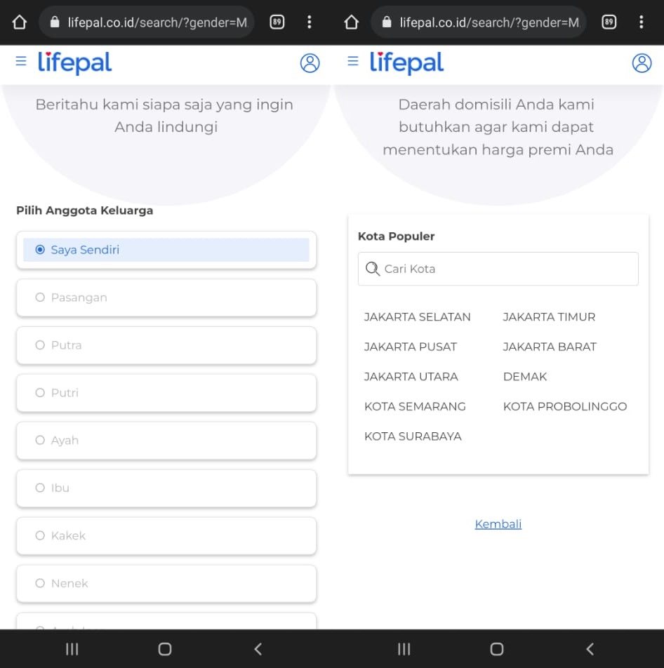 4. Pilih Anggota Keluarga, “Saya Sendiri”, “Pasangan”, atau yang lainnya. Kemudian isi kan daerah domisili kamu agar dapat menentukan harga premi untuk kamu.