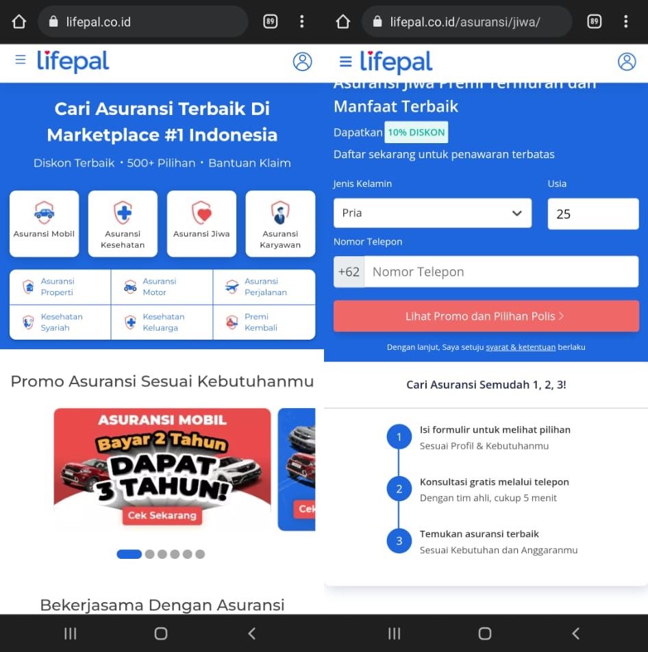 Untuk memilih, menemukan asuransi yang tepat dan terbaik untuk kita dapat dilakukan secara online melalui HP maupun PC Laptop, sehingga tidak perlu repot-repot mendatangi kantor asuransi apabila ingin mendaftar. Untuk itu kamu dapat menemukannya dan membelinya di situs Lifepal. di Lifepal banyak tersedia pilihan jenis asuransi, baik dari asuransi jiwa, kendaraan hingga asuransi karyawan. Cukup ikuti petunjuk beberapa langkah maka kamu akan mendapatkannya!
