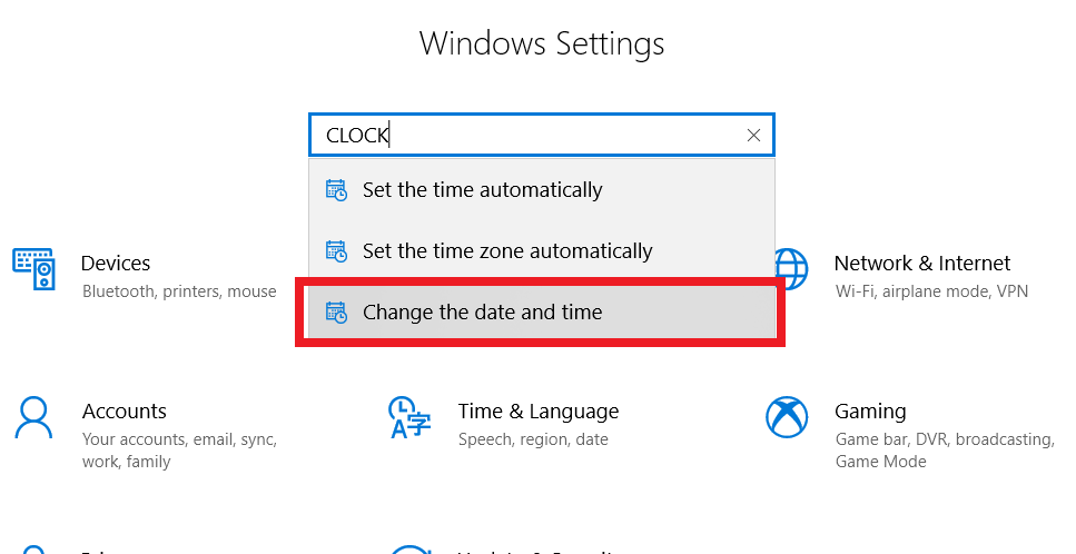 2. Lalu pada kolom pencarian di Windows Settings kamu ketik Clock dan pilih menu rekomendasi dengan nama Change the date and time dan klik pada menu tersebut.