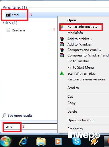 1. Buka CMD (command prompt) di start menu. klik kanan pada aplikasi CMD lalu pilih “Run as administrator“.