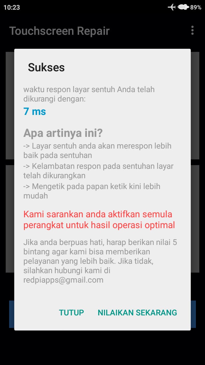 6. Jika proses perbaikan telah selesai, maka akan ditampilkan informasi mengenai pengurangan waktu respon layar sentuh.