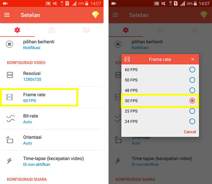 4. Cara Kedua adalah dengan mengubah Frame Rate video. Pilih Frame Rate dan cari ukuran yang dibutuhkan. Untuk merekam video tutorial, kita bisa memilih 30FPS, karena video tutorial tidak memerlukan detail video yang terlalu besar. Untuk merekam video Gaming, pilih 50 atau 48 FPS agar kualitas video tidak terlalu lambat.