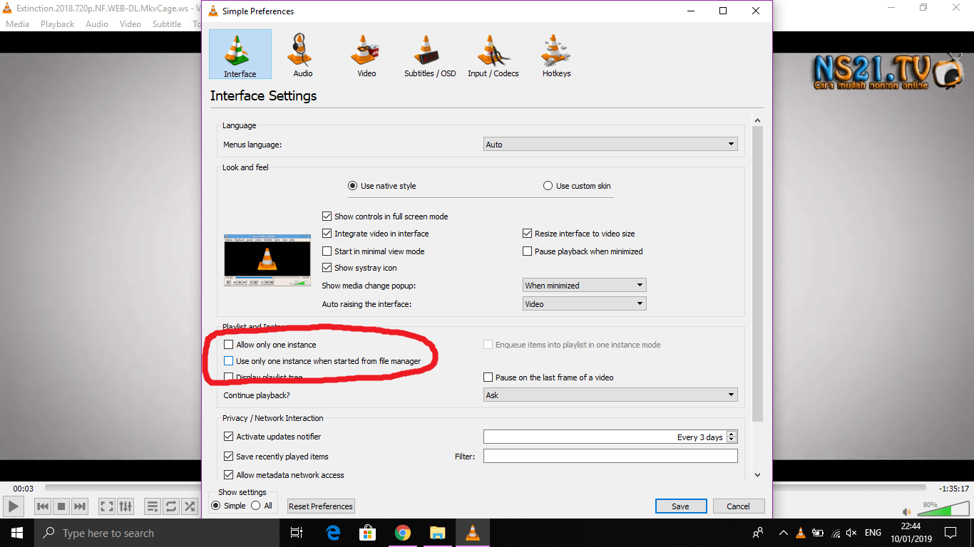 3. Hilangkan tanda Centang pada “Allow only one instance” untuk memutar lebih dari satu video / audio ketika diputar langsung melalui aplikasi VLC (pada Navbar klik media – open file) dan “Use only one instance when started from file manager” untuk memutar lebih dari satu video / audio langsung dari file manager.