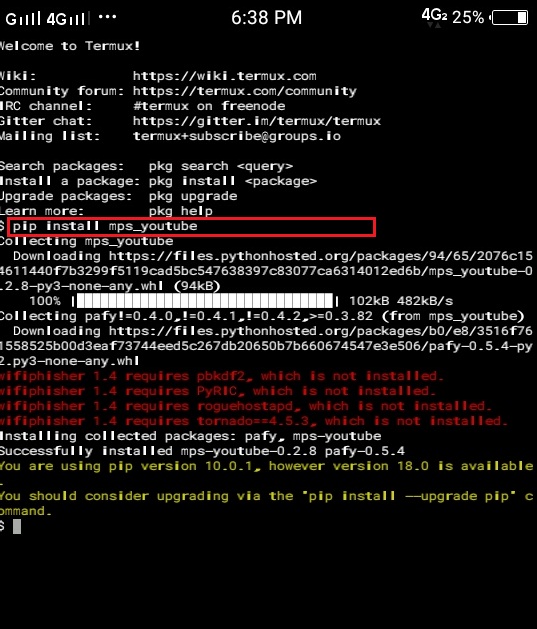 1. Install aplikasi Termux di Play Store. Buka aplikasi Termux terminal kamu lalu ketikkan perintah $pip install mps_youtube. Disini kita akan menginstall alamat tujuan yakni https://www.youtube.com dan juga menginstall tampilan Youtube di aplikasi Termux terminal ini.