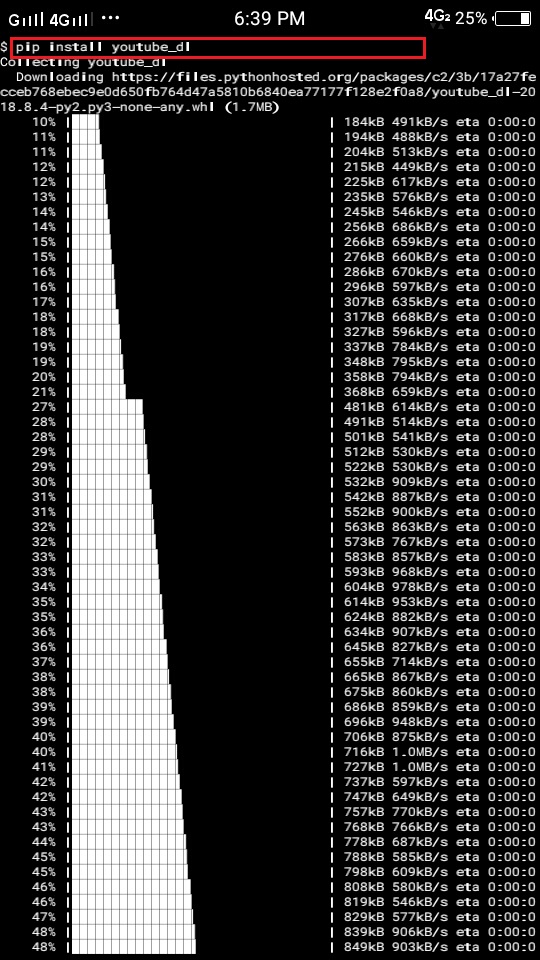 2. Setelah menginstall tampilan youtube dan alamat tujuan, selanjutnya ketikkan perintah $pip install youtube_dl. Fungsi menginstall perintah tersebut adalah, termux akan menginput data, judul lagu, album, serta meng–update semua musik yang ada di youtube.
