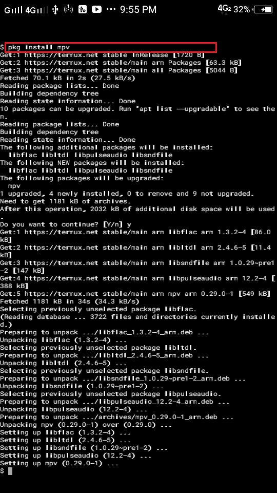3. Tahap selanjutnya ketikkan perintah $pkg install mpv. Pada perintah ini kita akan menginstall sebuah media pemutaran musik di Termux. Seperti di Windows ada media pemutaran musik Windows Media Player dan media musik Winamp, kalau di Termux disebut media pemutaran MPV.