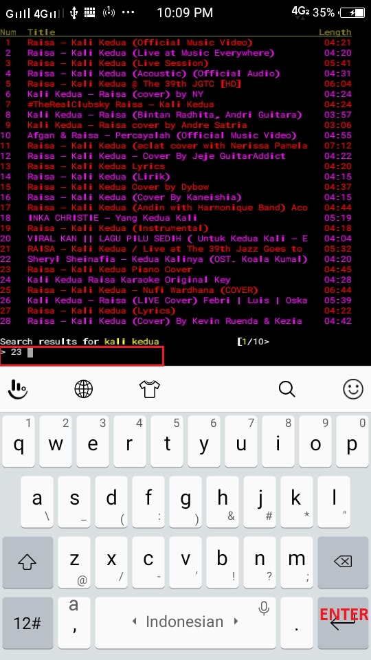 Pencarian akan berlangsung dan termux akan menampilkan semua judul lagu dengan kata kunci /Kali kedua. Jika kamu ingin memutar lagu ketikkan nomor lagu yang sudah tertera pada pencarian tersebut. Contohnya >23 lalu tekan Enter.