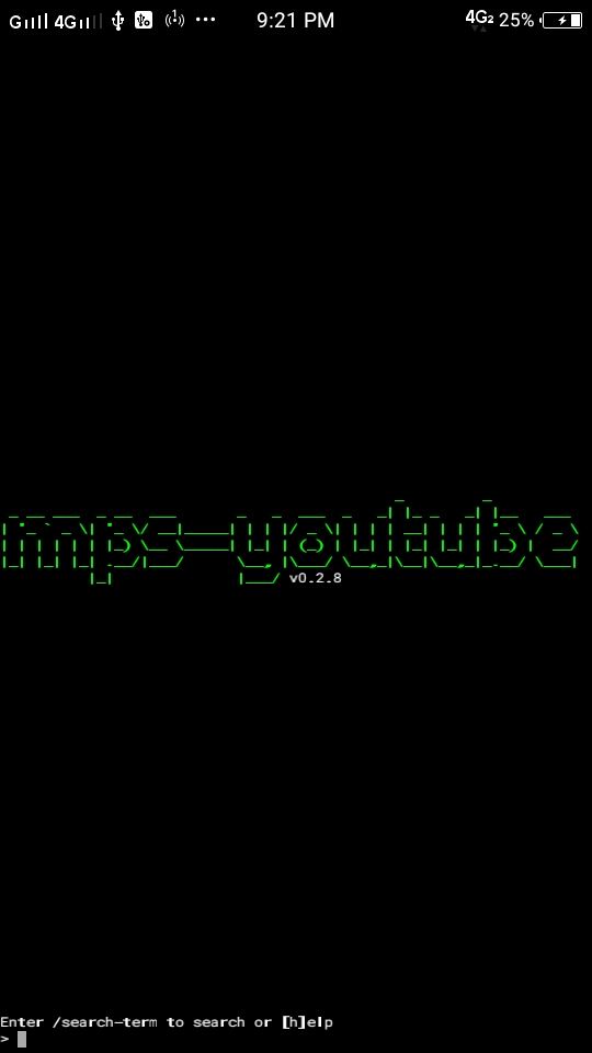 4. Setelah media pemutaran di install, selanjutnya ketikkan perintah $mpsyt. Nah, fungsi dari perintah tersebut adalah, Termux akan menampilkan halaman youtube dan kolom searching.