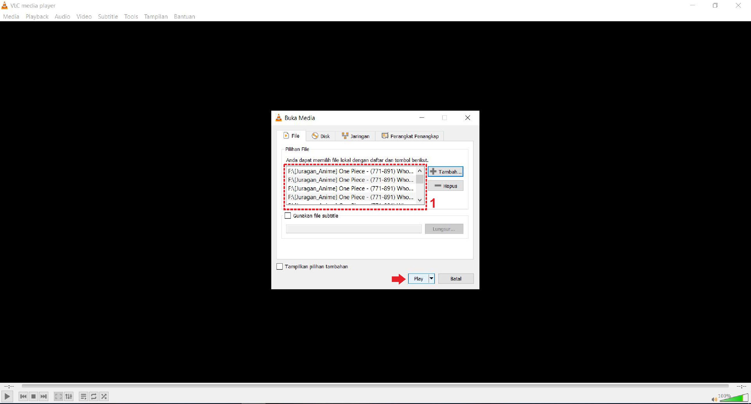 5. Maka file yang sudah dipilih tadi akan masuk ke kotak dialog. Jika sudah semua, klik Play.