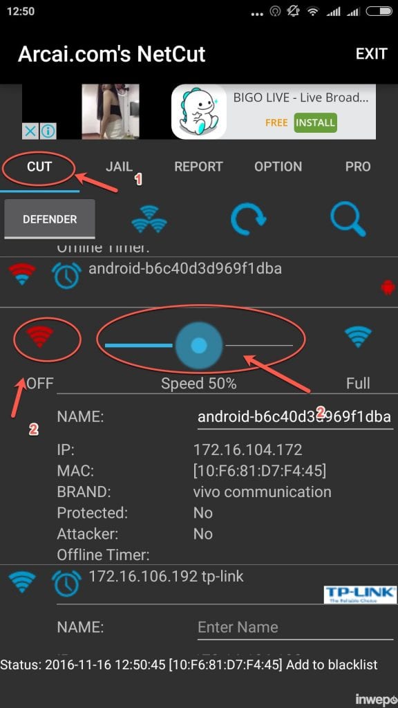 4. Kamu bisa memutuskan koneksi Wi-Fi orang tersebut atau mengurangi kecepatan internet orang tersebut. Masuk ke menu CUT.
