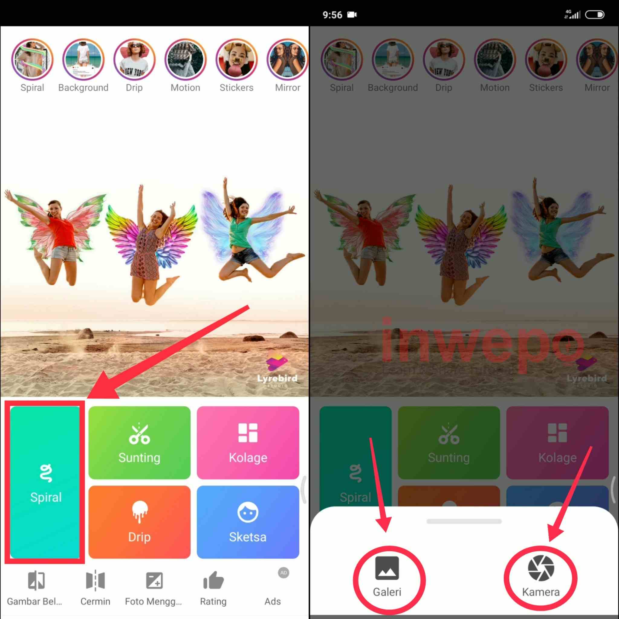 2. Langkah kedua, buka aplikasi Instasquare editor kemudian, tap menu Spiral lalu akan muncul dua pilihan tap menu Galeri untuk menambahkan foto dari galeri atau tap menu Kamera untuk menambahkan foto dari kamera smartphone.
